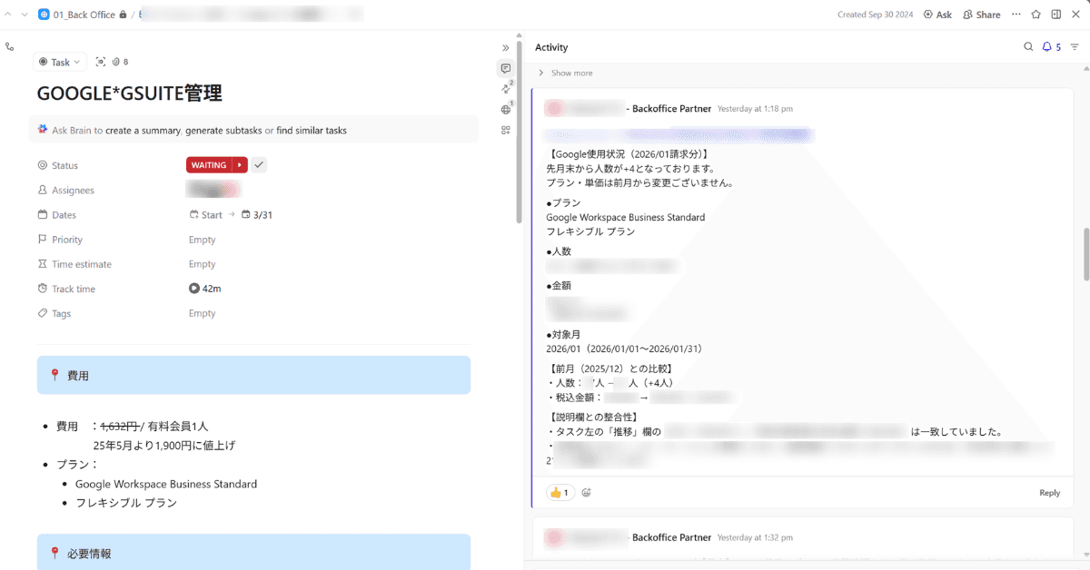 感覚値としては、1ツールあたり毎月30〜40分かかっていた「請求書を読み込んでシートに転記し、前月と見比べる」作業が、「スクショを貼る+コメントを読む」フローにまとまり、3分の1〜4分の1程度の時間で済むようになったイメージです。