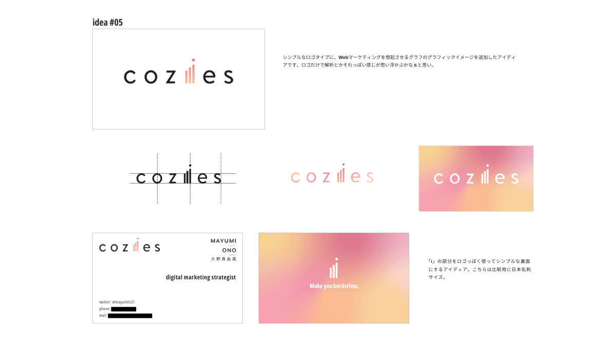 もう一つは、デジタルマーケティングらしさを出したくて、Coziesの「i」を電波や成長するグラフのイメージで作ったもの。「i」を強調したのは、個人で立ち上げたことを象徴したいという意味もありました。結果的に、後者のロゴに決まったけど、サンセリフ体のすっきりとしたタイポグラフィで、5年経った今の風潮から見ても風化しにくいデザインになっていたかなと思います。