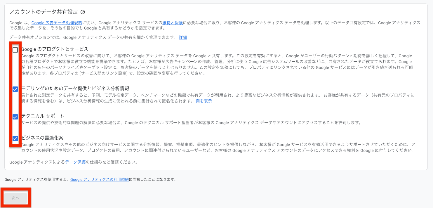 次に「アカウント名」「アカウントのデータ共有設定」を確認し、問題がなければチェックを入れて最下部の「次へ」をクリックします。