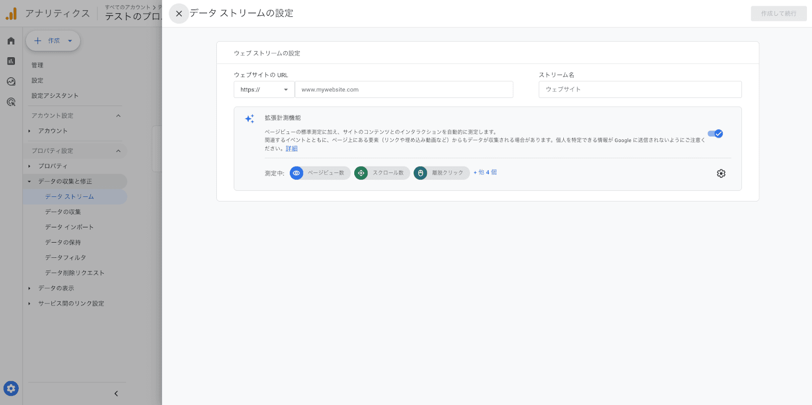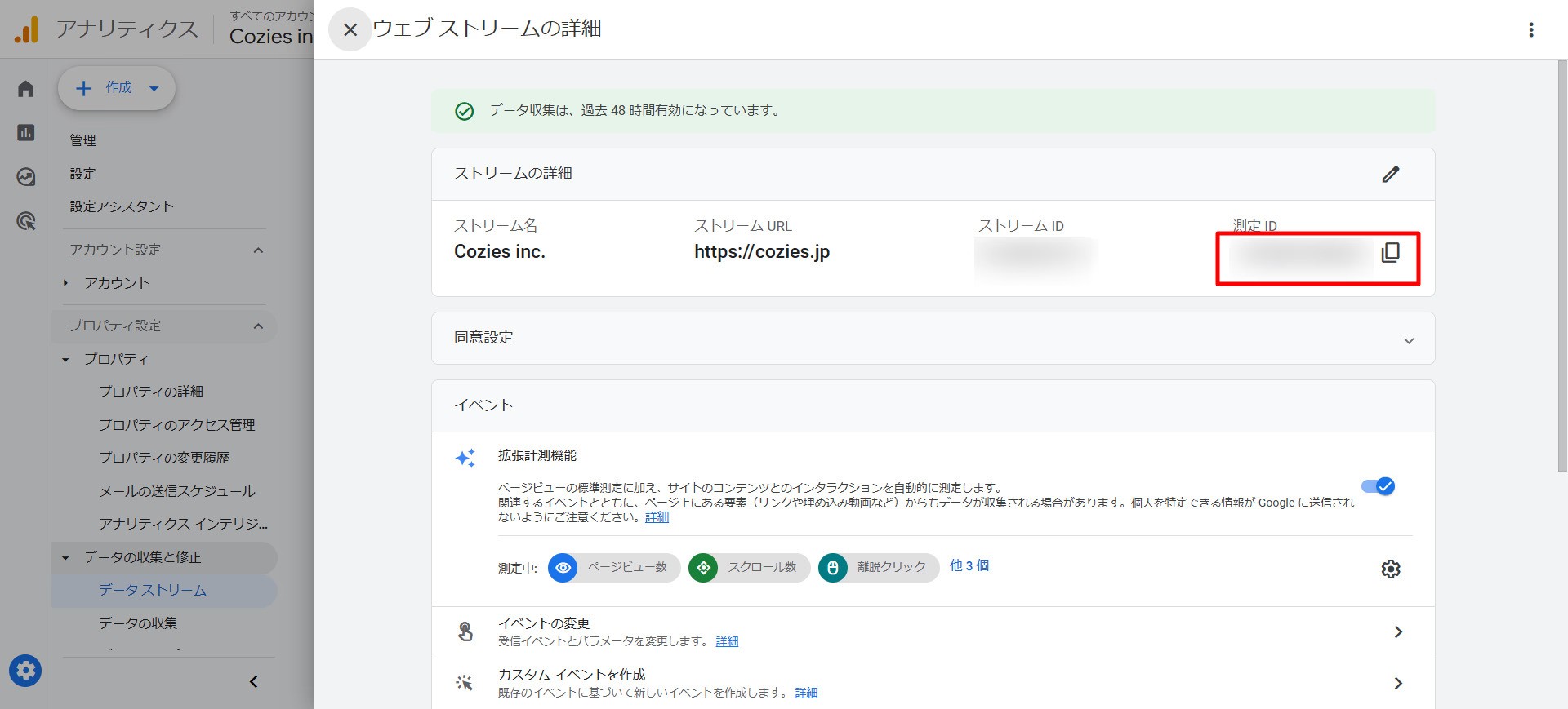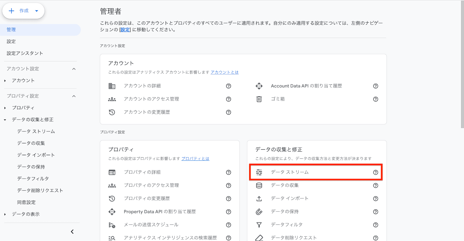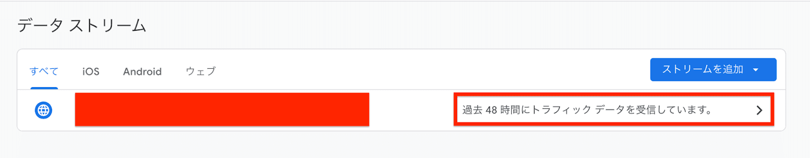 管理画面の「データストリーム」をクリックしてください。「過去48時間にトラフィックデータを受信しています。」という文言が書かれていれば、無事に収集できています。