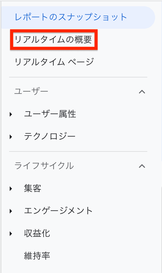 管理画面の「レポート→リアルタイムの概要」をクリックしてください。