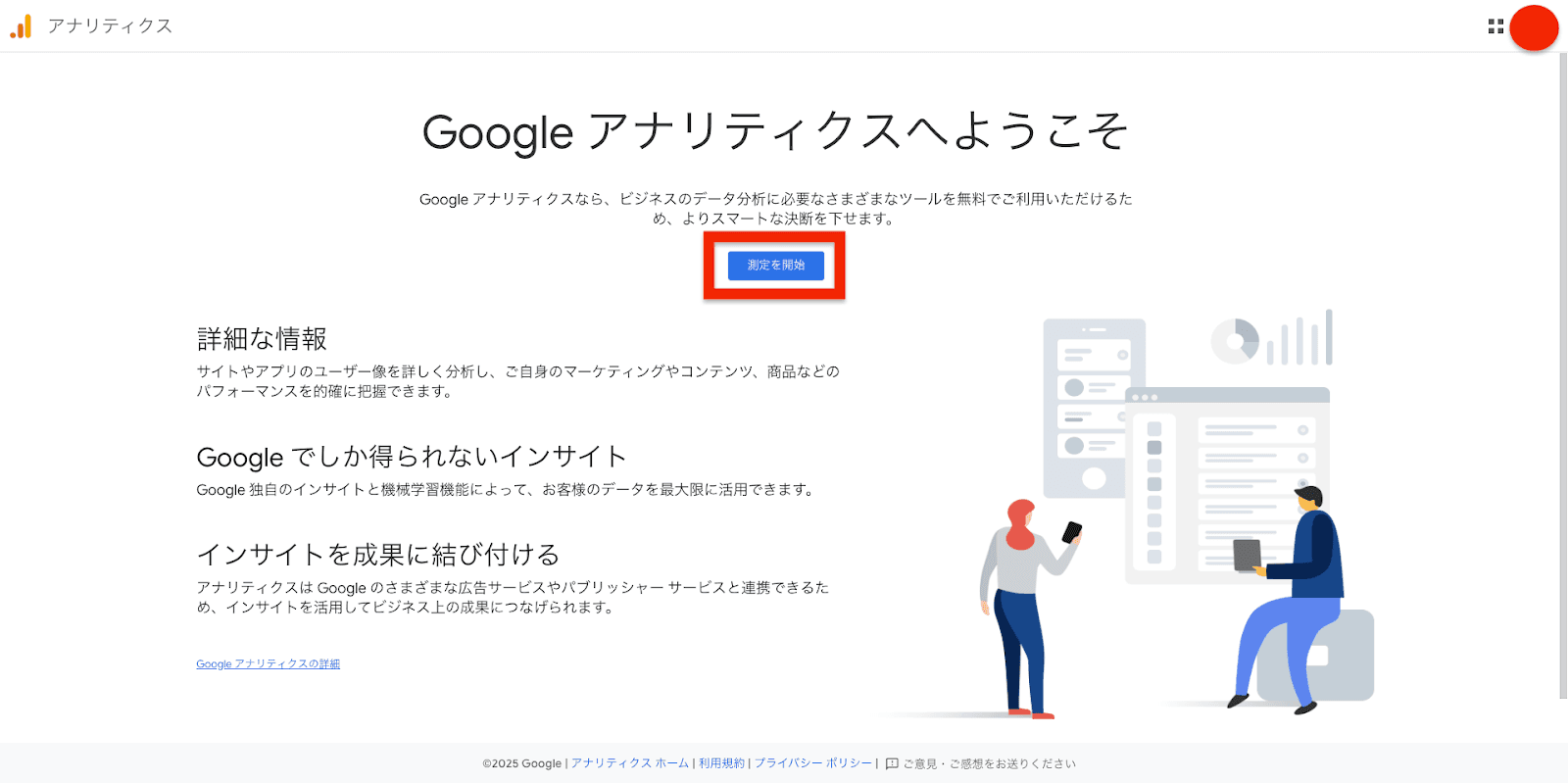 Googleアカウントを作成したら、次に「GA4のアカウント」を作成します。まずはGoogleアナリティクスの公式サイトへアクセスし、中央の「測定を開始」ボタンをクリックしてください。