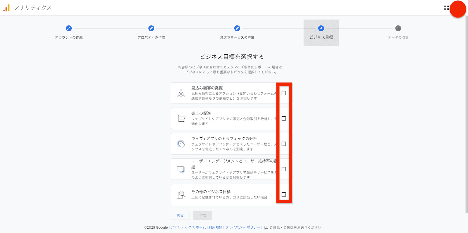 そして、以下の「ビジネス目標を選択する」から、該当する自社のビジネス目標をクリックしてください。ビジネス目標の違いによって今後のレポート画面が異なるため、明確にしてから選択することがオススメです。なお、ビジネス目標は後ほど変更可能なので、まだ決まっていない場合はそのまま次に進んでも問題ありません。
