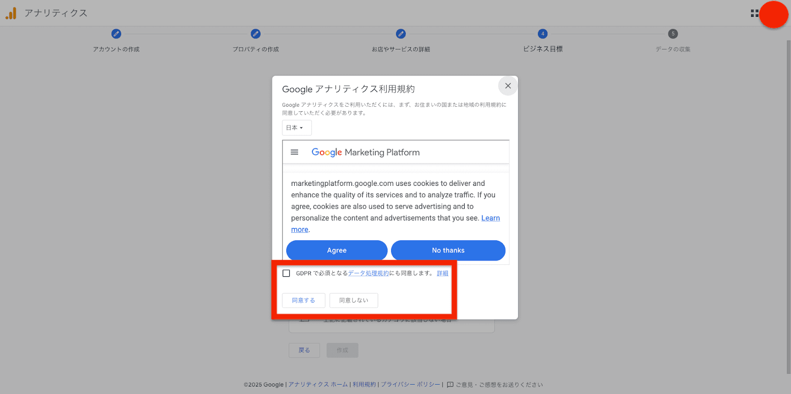 最後に、Googleアナリティクス利用規約とデータ処理規約を読み、問題がなければチェックと「同意する」をクリックします。
