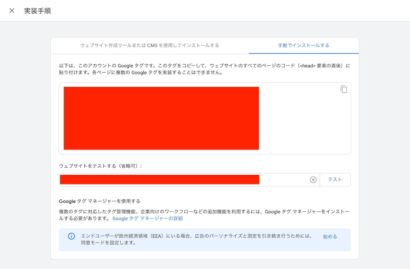 「手動でインストールする」をクリックすると、Googleタグ(gtag.js)のコードが表示されます。このコードをコピーし、Webサイトのすべてのページの<head>タグ内に貼り付けて保存してください。