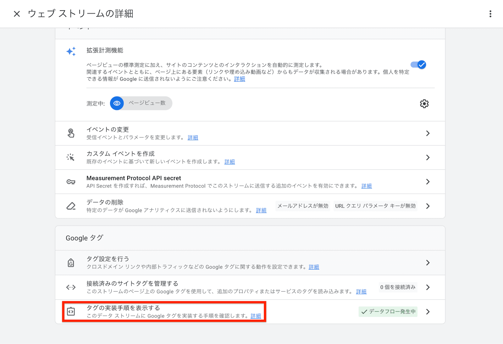 編集するデータストリームをクリックしたら、「Google タグ→タグの実装手順を表示する」を選択してください。