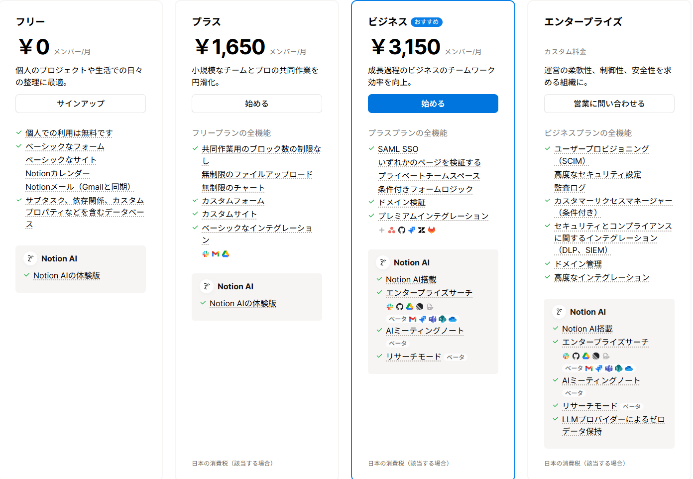 一方、Notionでは、小規模なチームであれば月額1,650円からのプラスプラン、ツールの利用で急成長を狙うのであれば月額3,150円のビジネスプランがおすすめです。プラスプランは、情報共有を強化したい小規模チームにおすすめできます。
